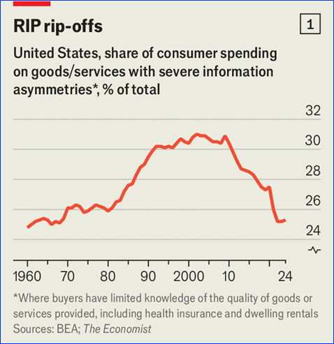 «Muchas teorías económicas sobre la información asimétrica, aunque lógicamente correctas, han quedado empíricamente obsoletas», argumentaron Tyler Cowen y Alex Tabarrok, ambos de la Universidad George Mason, en 2015. Estimamos que aproximadamente el 25 % del gasto del consumidor estadounidense se destina a bienes y servicios con graves asimetrías informativas, desde la atención médica hasta las reformas del hogar, frente al 30 % a principios del milenio (véase el gráfico 1).